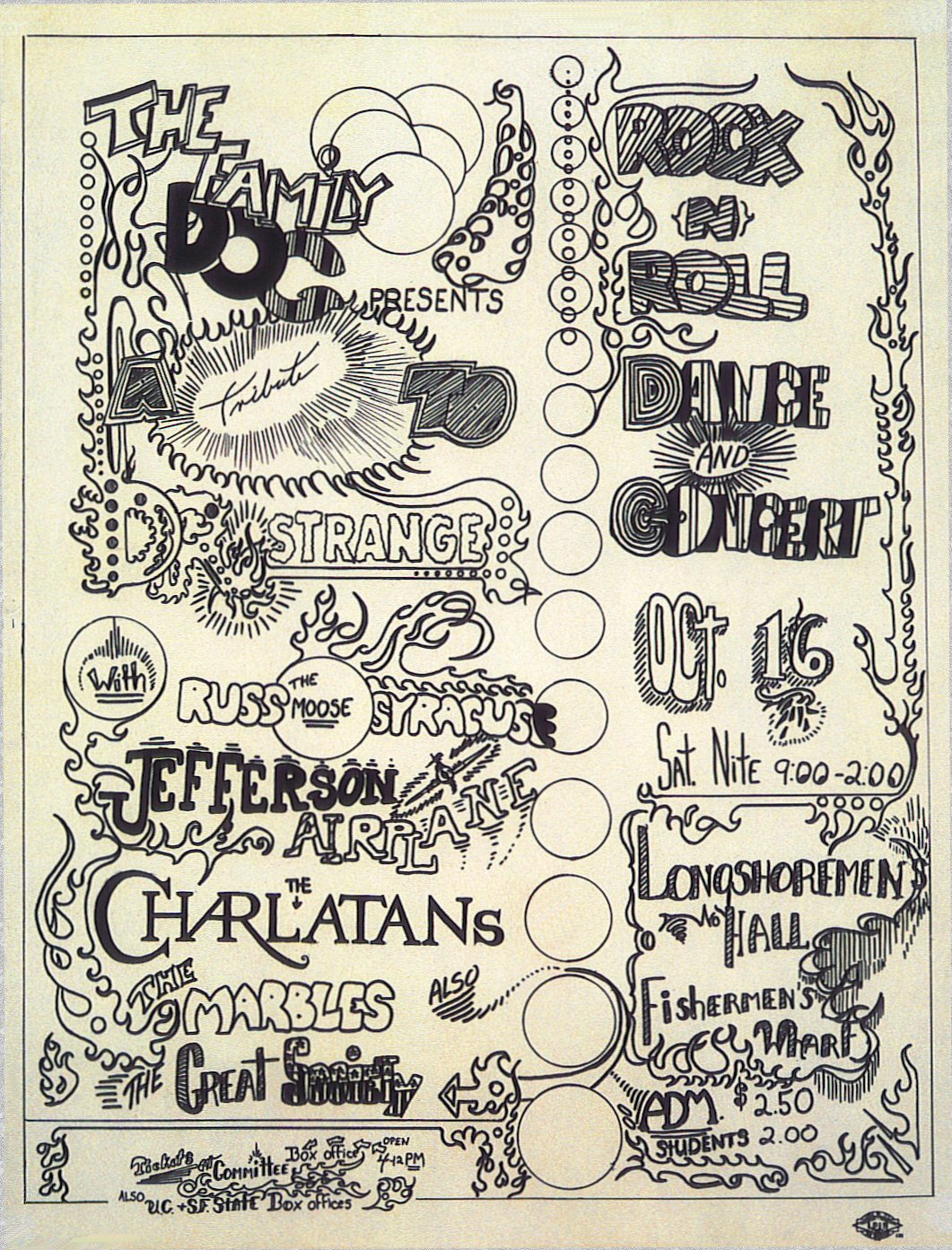 The very same night as the ‘Appeal’ Party, the original Family Dog Collective hosted what I believe was their last dance before Chet Helms, already associated with them, took over the production company name (which had come from a Haight-Ashbury house where many of the members—Alton Kelley, Ellen Harmon, Luria Castell, and others—lived at one point or another). A Tribute to Ming the Merciless featured Frank Zappa’s Mothers of Invention and the Charlatans, once again at Longshoreman’s Hall. Only this time, rowdy teenagers from the Mission showed up, scuffles broke out, and it was a much less positive experience for the organizers. Once again space—who moved through it and how, with what energies and in harmony or dissonance with others—was a key part of the story. Zappa, being Zappa, supposedly narrated the brawling and fighting from the stage during the performance by the Mothers.