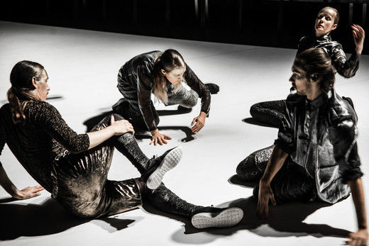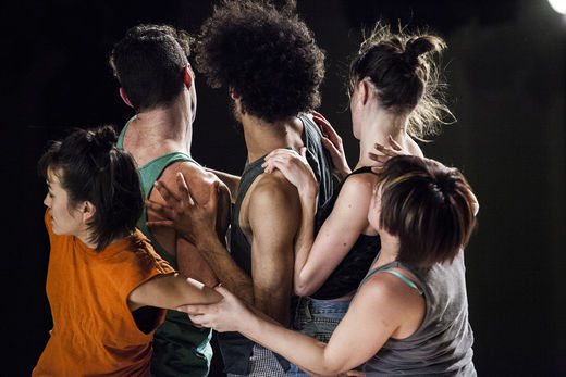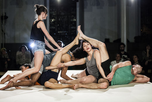 If Ingri Fiksdal’s circles were unfussy, the participatory encircling of Faye Driscoll’s work Thank You For Coming was quite the opposite: extremely fussy. This was a piece that obsessed, in wonderful ways, over the relationship of audience to performers. Again, we were placed on stage with the dance company, this time sitting on the floor. The dancers first appeared on a slightly raised stage as a kind of amoeba-like clump engaged in what a number of commentators have accurately described as a contemporary dance version of the game Twister. The ensemble members took various poses of discomfort that emphasized their individualities becoming subsumed— but never entirely erased—in the need for the group to keep its balance. A foot in the face, a limb stretched over a shoulder, an arm pushed up against a back with not enough room to extend, then twisted around a head. There was a durational element to the first section of the piece: a virtuosic display of abdomen-muscle-straining stillness and intra-group competition constrained by collective coordination.