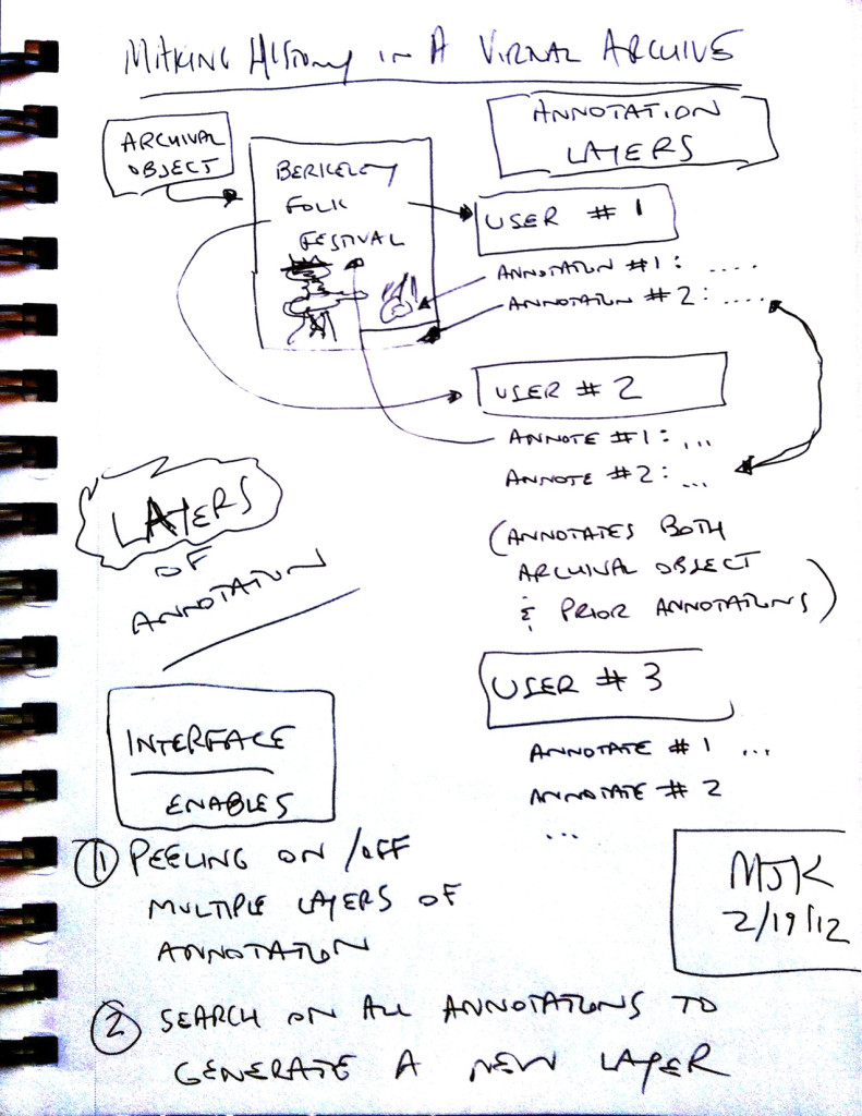 With the Making History in a Virtual Archive, what I’m starting to imagine is the digital research workshop as the central element. In place of presentation and passive reception the goal is a platform for more active use of archival materials. In this case, these archival materials relate to vernacular music and the folk revival, but the notion of designing a successful digital research workshop is relevant for any collection or body of digitized materials.