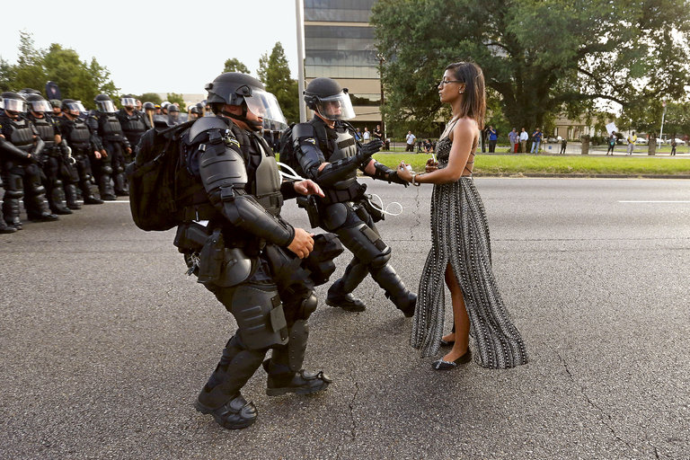 Jonathan Bachman’s image of Keshia Evans from the Black Lives Matter protests in Baton Rouge this July adds to this iconographic lineage. Novelist, critic, and photographer Teju Cole recently wrote of this and other “superhero photographs” from the Black Lives Matter movement. As Cole astutely points out, “Black Lives Matter as a movement originated in images: the video clips showing the extrajudicial killing of black people.” For him, “The ‘superhero’ photographs of protesters, with their classic form and triumphal tone, are engaged in a labor of redress. They bring a counterweight to the archive. Against death and helplessness, they project power and agency.” Cole argues that these images symbolize “the existence of many unacknowledged everyday black heroes.” The “images of supernatural heroism don’t confuse us about what the human body can accomplish or endure. What these images do is make elaborate internal states like patience, fearlessness, anger and dignity temporarily visible.” They also, as he points out, tap into a memory bank of photographs: “Images trigger our memory of the history of images.”