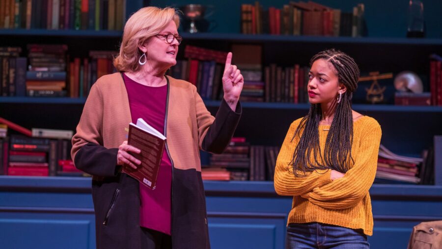 At its best, the play ultimately excels at catching these subtleties and ambivalences. The staging literally has the two characters tensely circle each other as if in an intellectual cage match; each actress’s body language intensifies their journeys through moments of anger and, in other moments, self-questioning. Unlike other controversial dramas located in professor’s offices—one thinks especially of David Mamet’s boomer-dude sexual harassment melodrama Oleanna—The Niceties strives to move past making one of the characters a straw man (or more accurately, in both plays, a straw woman!). Burgess seems most intrigued by the concept of sustaining both sides of the debate about knowledge, race, power, and justice on campus in a tangle of divergence yet also occasional, fleeting empathy. This is not the story of two people completely misunderstanding each other. It is the story of two people continually trying to grasp the perspective of the other, and yet still unable to find stable common ground.