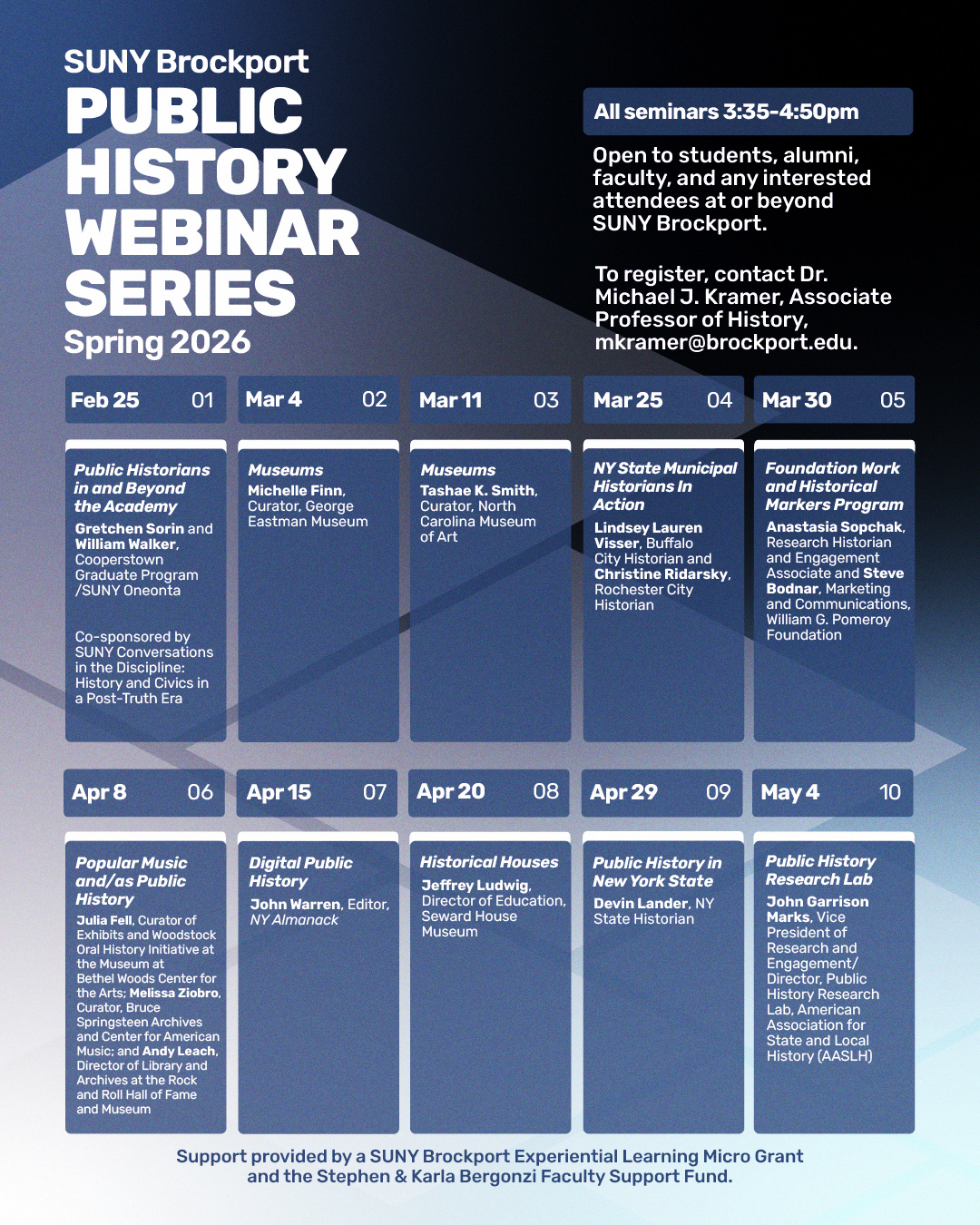 A series of ten presentations and conversations focused on public history and open to all Brockport students, alumni, faculty, staff, or any interested citizens of New York State or beyond. All seminars 3:35-4:50pm. To register, contact Dr. Michael J. Kramer, Associate Professor of History, mkramer@brockport.edu.