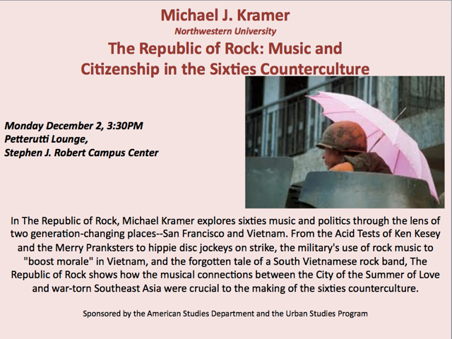 - Undergraduate Honors Society Keynote Address: The Republic of Rock – Music and Citizenship in the Sixties Counterculture