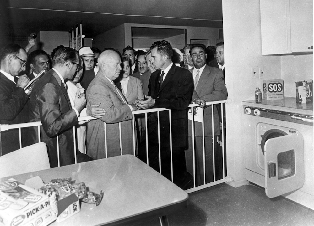 The rise of containment as geopolitical strategy pervaded domestic American culture. But then, in yet another irony, it bounced back to the international sphere. While at home a fad for suburban backyard atomic bunkers spread, by the Kitchen Debate in 1959, US Vice President Richard Nixon debated the virtues of American mass consumer culture with Soviet premier Nikita Khrushchev at the American National Exhibition at Sokolniki Park in Moscow. The two men did not stand in front of missiles and bombs, but rather a mock display of a postwar US kitchen, with all its electronic appliances, consumer durables, and mass consumer products. The domestic culture of Cold War containment had bounced back to the international concerns of foreign policy.