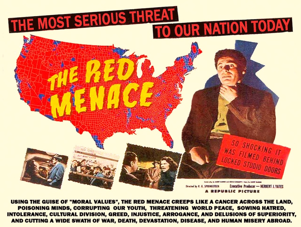 Sometimes, with students, we restage the Kitchen Debate, but this year I had a bit less time to work with in the course, so I opted for a new idea: after we explored the televised Joseph McCarthy hearings (“Have you no decency, sir?” said lawyer Joseph N. Welch after planting a trap that Joseph McCarthy walked right into despite the pleadings of his righthand man, Roy Cohn, later a mentor to Donald Trump) and looked briefly at the infamous Red Channels: the Report of Communist Influence in Radio and Television pamphlet, we took a peek at various Hollywood film posters that marked the Cold War containment era.