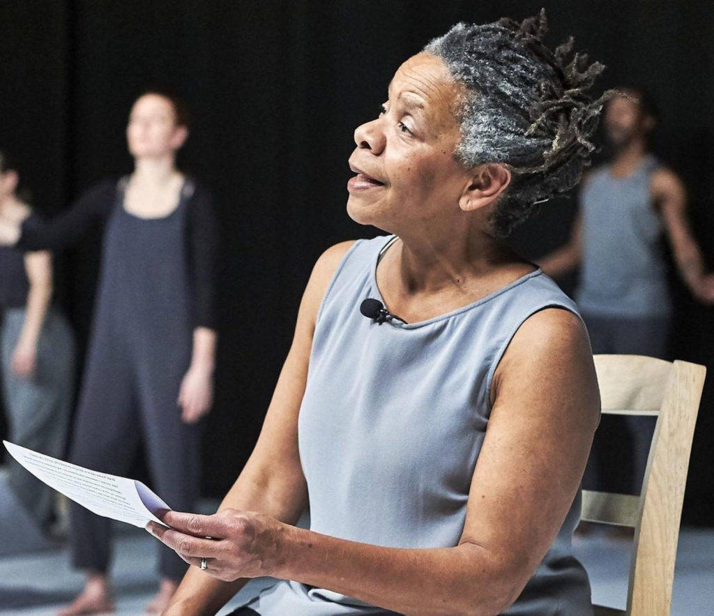 In Miller’s hands, choreography and dance become the means for exploring these questions as part of the “endlessly variegated” qualities of “everyday experience,” phrases she quotes in her program note. They come from a study of Gertrude Stein by the literary critic Astrid Lorange. As the reference suggests, writing—and language in general—figures heavily in the piece, with Miller presiding as a kind of master of ceremonies speaking to the audience or reading from things like an excerpt from a grant application. So too, the everyday is essential. The informal tone begins at the outset. There is no dramatic darkening of the house lights or musical prologue. Instead, the dancers merely walk out on the sparse stage with the house lights up and Miller introduces her ensemble, a group of magnificent performers: Angie Hauser, Michelle Boulé, Christal Brown (full disclosure: a colleague of mine at Middlebury College), Sarah Gamblin, Bronwen MacArthur, and Trebien Pollard (Darrell Jones, while not performing in this iteration of In a Rhythm, has been another important participant in its making).