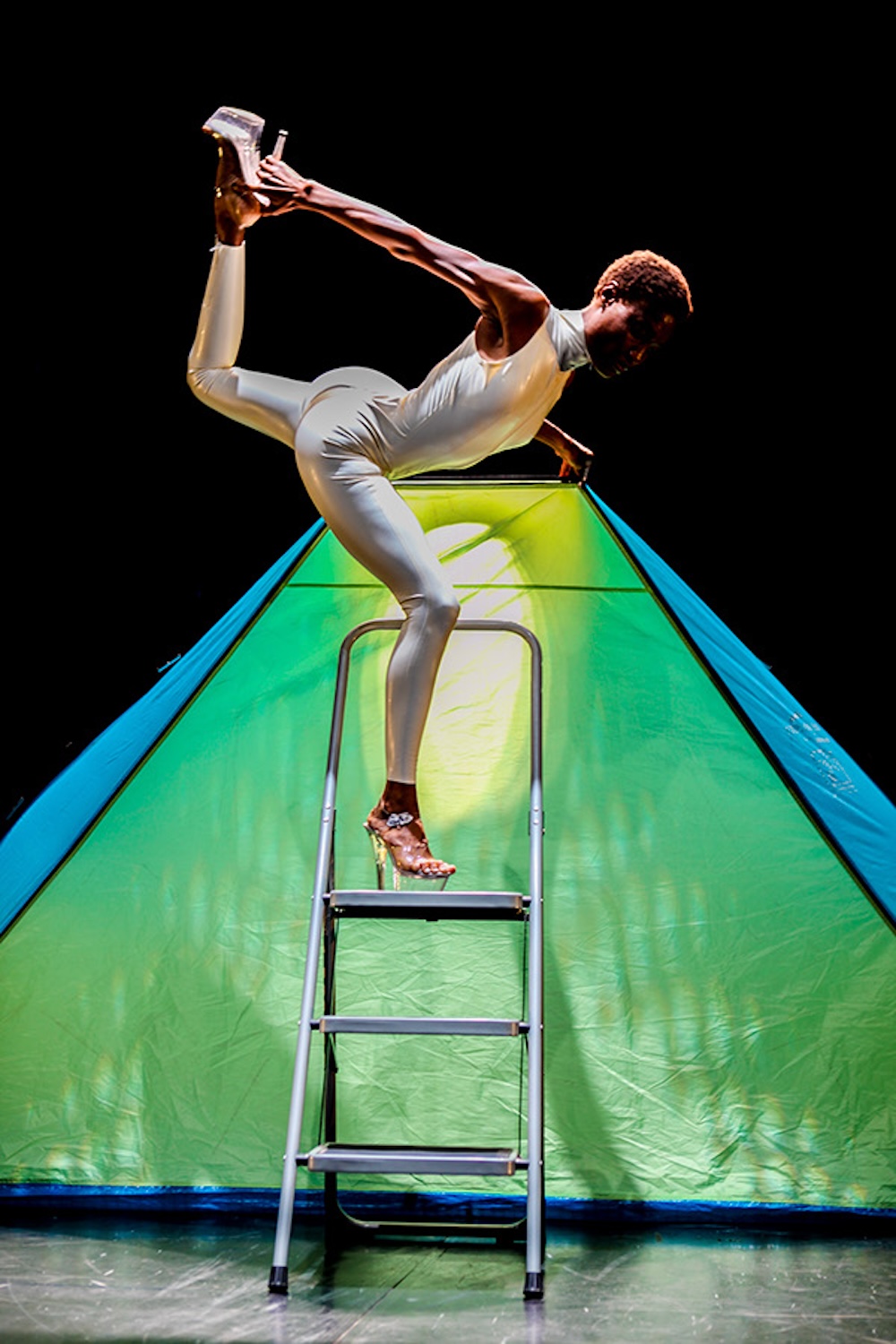 Inside the theater itself was a sort of bivouac tent. Xaba performed send ups of Black Forest German romanticism, reversing the colonial gaze. Xaba crouched within the tent, in silhouette shadow puppet form we watched her strike various poses, both ridiculous and difficult, such as balancing a beer on her head. On the front of the tent a projector placed classic images of quaint German folk culture: town squares and Bavarian architecture and the like as German accordion music played over the theater’s sound system. Then, in the next section, she turned to Asian traditional dance in a kind of disorientation of Orientalism, eventually unzipping part of the structure and poked her head through to perform a kind of parodic Asiatic dance of the eyes. Following these sequences, commercials of racist imagery from German television were projected across the surface of the tent. Then Xaba emerged in full, wearing a skin-tight body suit, to perform a kind of mock-Grace Jones strut to the music of Nina Hagen. She moves out in front of the tent and opens up a step ladder, climbing up and down in heels. Her movements are half-hearted, emphasizing what seemed to be a disheartened lack of enthusiasm within what is imagined as the ultimate in sexy chic stylish blackness.