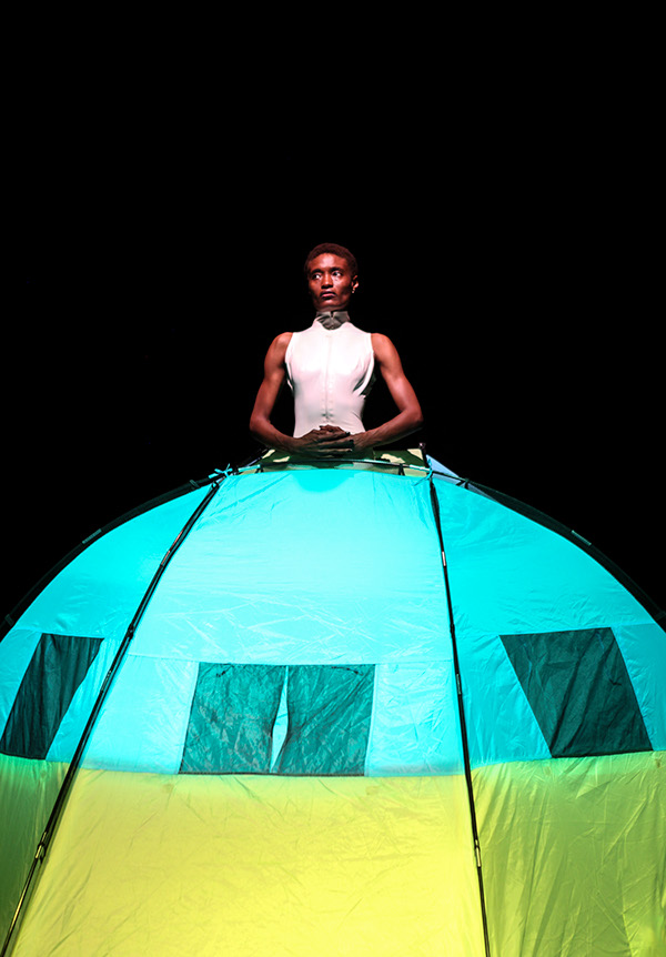 We gazed at Xaba in Fremde Tänze, but she gazed right back at us, estranged, looking through her tent, climbing on her ladder, sauntering past us while balancing minstrel-stereotype donut figurines around her neck, in her hyper-sexualized super-sleek outfits that turned out, in the end, to be made of mass-produced tampons. Encamped before us in her tent, she did not need a podium to proclaim the pain barely contained by any sort of seal of approval.
